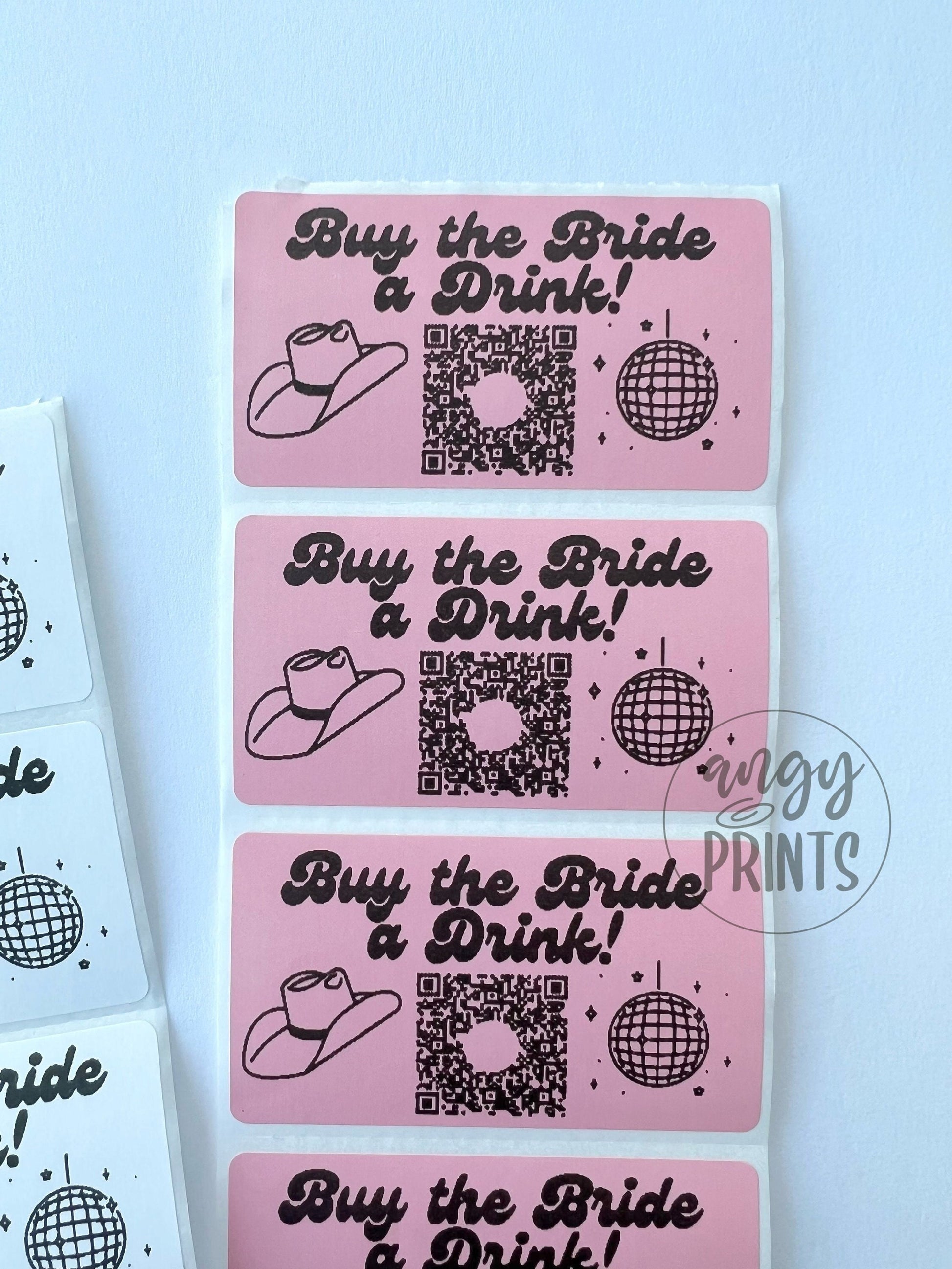 Buy the Bride a Drink Sticker Thermal labels in color white or pink. Design is printed directly on thermal labels therefore the ink will be black only. Please send a screenshot of the QR code you would like on the design through Etsy messages.