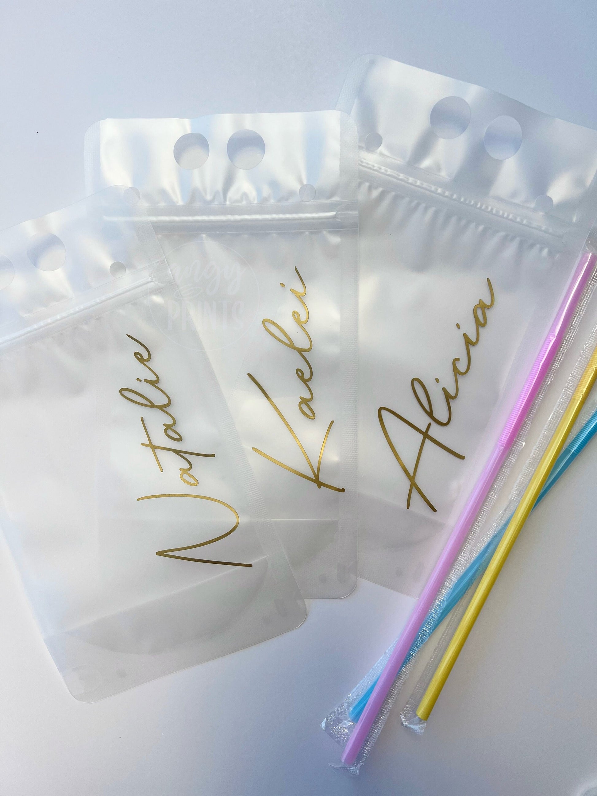 Tropical Vacation Bachelorette Personalized Name Plastic Clear Adult Beverage Pouches w/ Individually Wrapped Straw for Party, Day Drinking